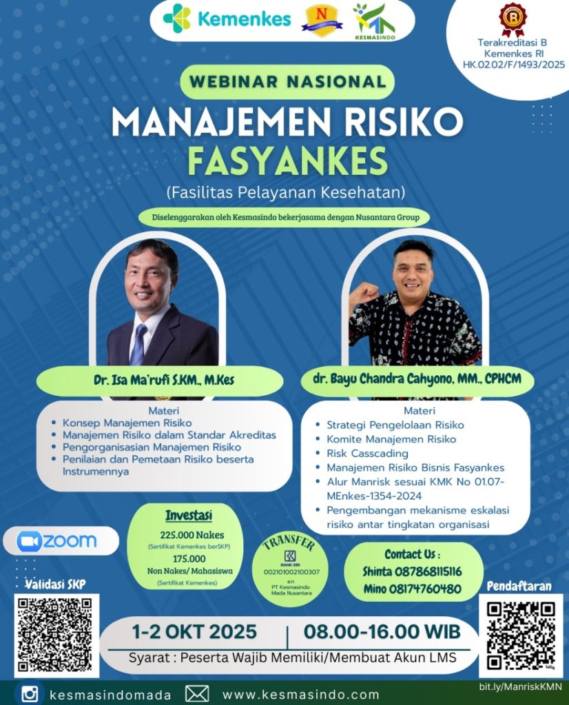 yuk segera daftar webinar nasional Manajemen Risiko Fasyankes (Fasilitas Pelayanan Kesehatan) yang diselenggarakan oleh Kesmasindo bekerjasama dengan Nusantara Group.